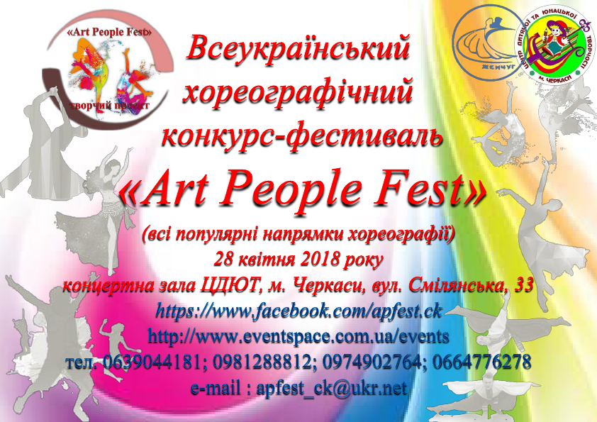 Всеукраїнський хореографічний фестиваль-конкурс «Art People Fest». Організатори фестивалю-конкурсу: Міська дитяча громадська організація «Танцювальний спортивний клуб «Жемчуг», позашкільний навчальний заклад «Центр дитячої та юнацької творчості м. Черкаси» Черкаської міської ради. Конкурс проводиться в рамках творчого проекту «Art People Fest». - народний танець,стилізований народний танець; - естрадна хореографія; - сучасна хореографія; - бальний танець; - класичний танець; - східний танець, беліденс; - вільна танцювальна категорія (допускається використання елементів художньої гімнастики, поєднання кількох танцювальних стилів тощо). Солісти, дуети (пари), тріо, ансамблі.